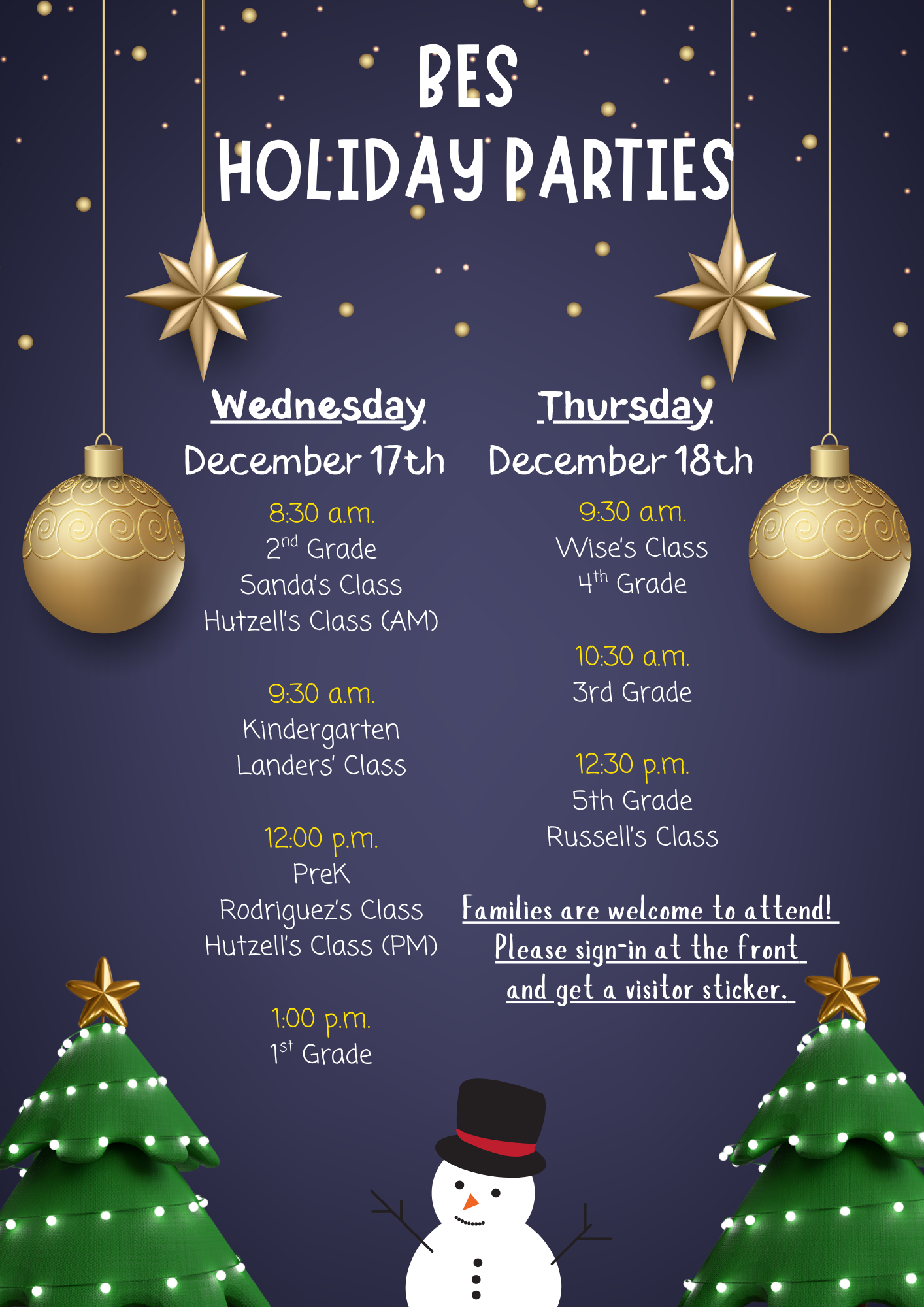 Holiday Parties We are looking forward to next week's holiday parties. We also wanted to remind you that we will be dismissing school at 10:45 AM on Friday, December 19, and there will be no after school program t... December 12, 2025